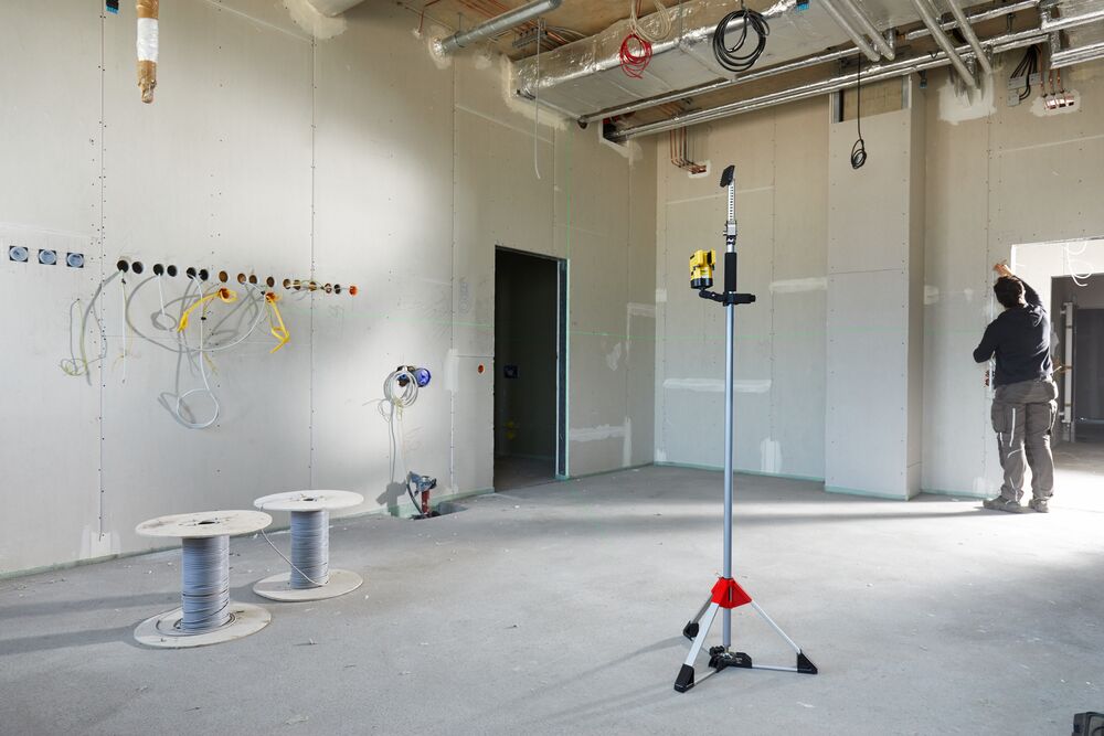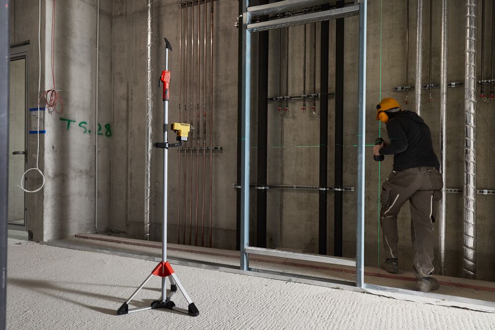Deckenstützen lassen sich auch ohne obere Verspannung frei im Raum platzieren und sind damit auch im Außenbereich einsetzbar