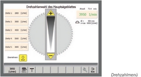 Elektromotorische Höhen- und Schwenkverstellung 0 – 46° für das Hauptsägeblatt mit automatischer Korrektur der Schnitthöhe bei Schwenkung des Sägeaggregats