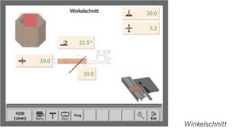 Winkelschnitt: Durch Abtrennen des Übermaßes wird nach Eingabe des Kantenwinkels das gewünschteFertigmaß erzeugt