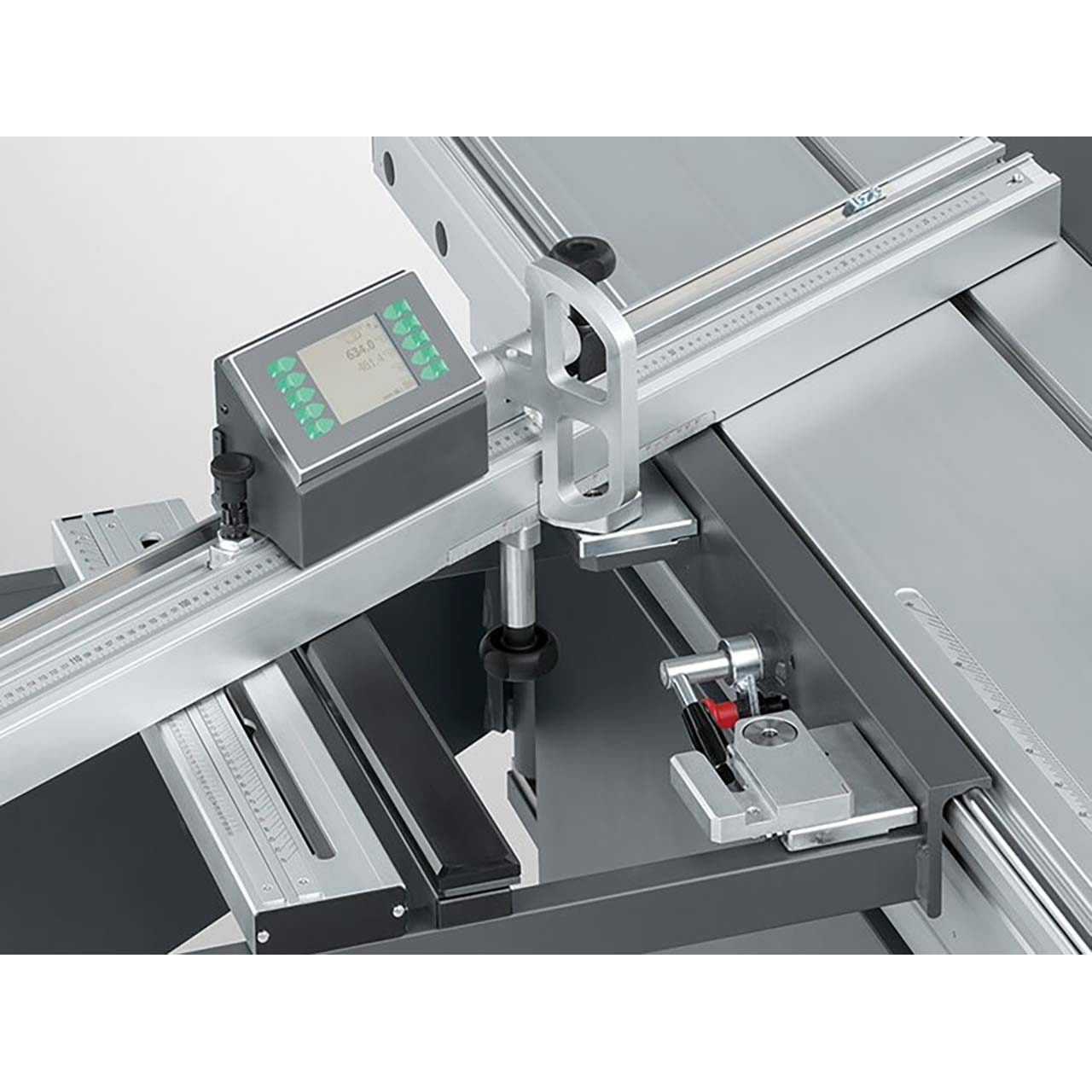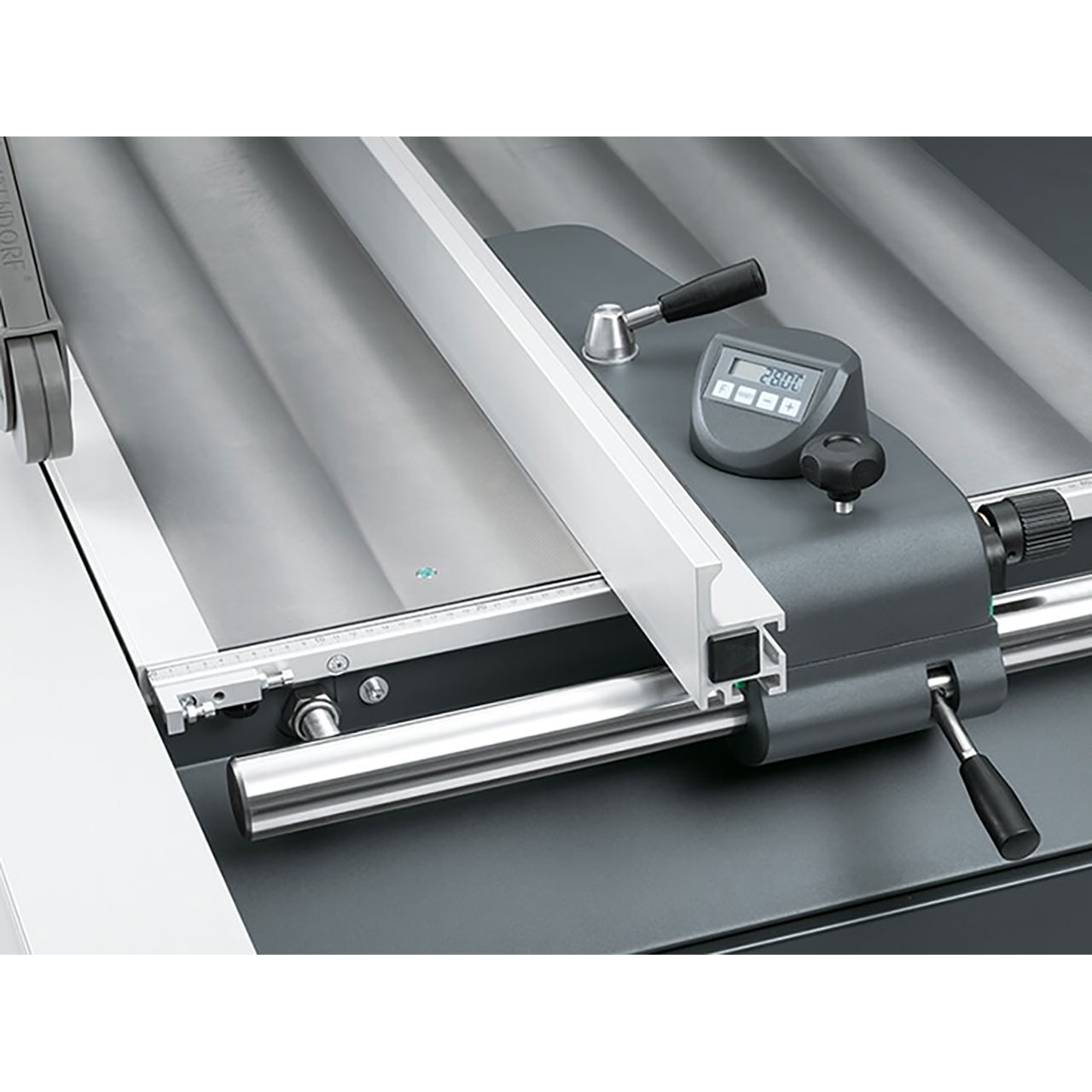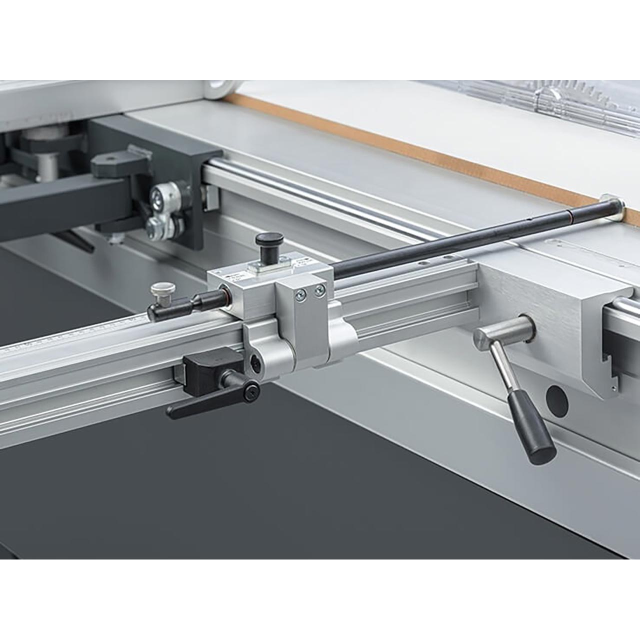- Der Anschlag ist leicht zu verstellen und dank der Feineinstellung sehr präzise manuell zu justieren. Seine Leichtgängigkeit erhält der ANschlag über das hart verchromte Rundstangensystem. Sollen große Platten aufgeteilt werden, kann er mit einem Griff unter die Tischebene geschwenkt werden. Es können Schnittbreiten von 800, 1000 oder 1300 mm gewählt werden!