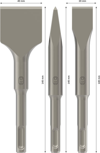 Standardarbeiten in Beton - Das dreiteilige Kurzmeißelset mit SDS max ermöglicht Standardarbeiten in Beton und Baustein für Renovierung und Restaurierung. Die Spitze des Spitzmeißels ermöglicht präzise Anpassungsarbeiten und die flache Schneidekante des Flachmeißels hohe Materialabtragsraten. Zum Set gehört weiterhin ein Spatmeißel zum Aufbrechen und Entfernen von Wänden aus Beton und Baustein bei gleichzeitig hohem Materialabtrag. Die Meißel können auch zum Wiederherstellen von Fugen und Freilegen von Armierungen verwendet werden. Sie sind kompatibel mit dem Aufnahmesystem SDS plus. Jedoch können sie auch direkt mit Hämmern des Typs mit SDS plus mit Drehstopp verwendet werden. Passend für alle SDS plus Bohrhämmer.