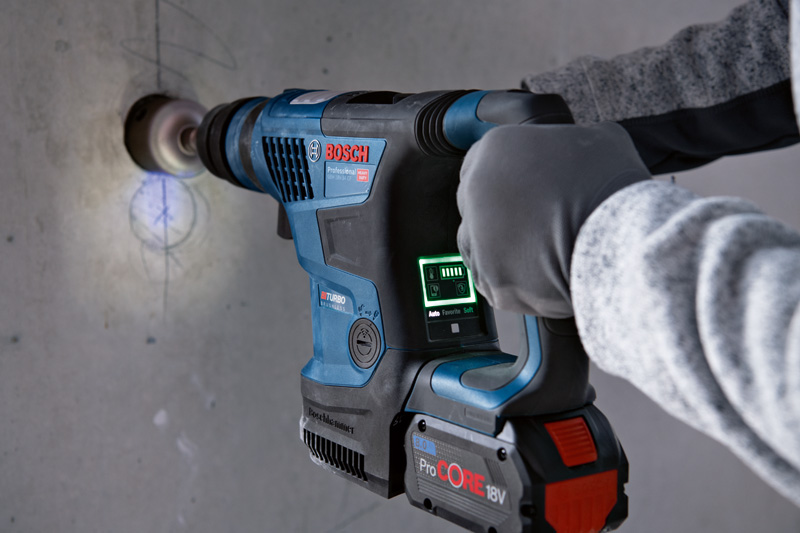 - Intelligentester SDS plus-Hammer – Werkzeugstatus in Echtzeit über die Benutzeroberfläche, individuelle Anpassungen per Bluetooth über die Bosch Toolbox App