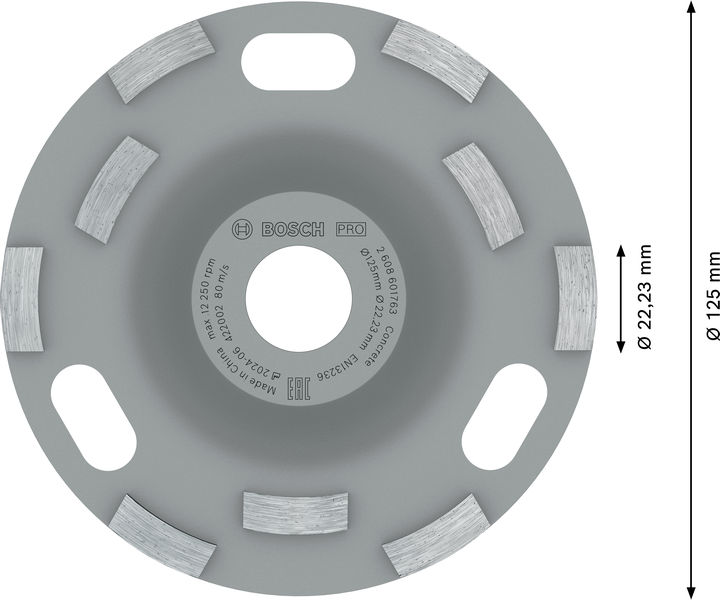 Hohe Materialabtragsrate - Die Expert for Concrete Diamanttopfscheibe mit hoher Geschwindigkeit sorgt für die schnellsten Arbeitsergebnisse in Beton. Die aggressive zweireihige Anordnung von 9 Segmenten minimiert zusätzlichen Arbeitsaufwand. Dank der großen Löcher in der Nähe der Kopfkante wird der Staub sofort entfernt, um beim Schleifen einen raschen Fortschritt zu erzielen. Die hohe Balance des Schleifkopfes sorgt für vibrationsgesteuertes Schleifen. Sie ist mit Winkelschleifern kompatibel. Die hohe Balance ermöglicht vibrationsgesteuertes Arbeiten, wodurch sowohl der Benutzer als auch das Elektrowerkzeug geschützt werden. Mit 22,23 mm Bohrungsdurchmesser für Betonschleifer und Winkelschleifer mit Spannmutter.