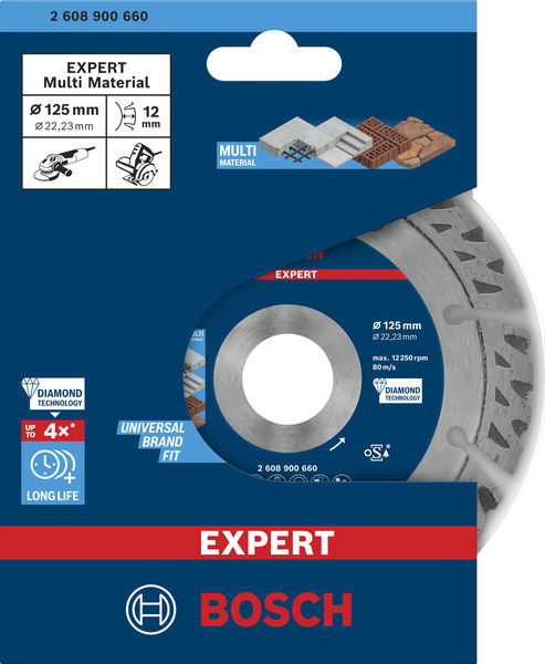 Herausragende Lebensdauer in Baumaterialien! Reibungsreduzierte Seitenflächen an den Segmenten zur Minimierung von Verschleiß an den Seiten. Auf modernen Baustellen müssen viele verschiedene, harte Materialien geschnitten. Die EXPERT MultiMaterial Trennscheibe ist das ideale Zubehör für vielbeschäftigte Bauprofis, die Beton, Ziegel, Dachziegel und Stahlbeton schneiden müssen, denn sie bietet einfach eine höhere Lebensdauer. Diese Mischung aus optimaler Diamantkörnung und fortschrittlichen Designmerkmalen sorgt für eine unübertroffene Langlebigkeit der Bosch EXPERT MultiMaterial Diamanttrennscheibe. Sie schneidet zuverlässiger und länger als andere Diamantscheiben von Bosch und bietet letztendlich ein hervorragendes Preis-Leistungs-Verhältnis. Außergewöhnlich robuste Schneidekante mit Bosch Diamond Technology.