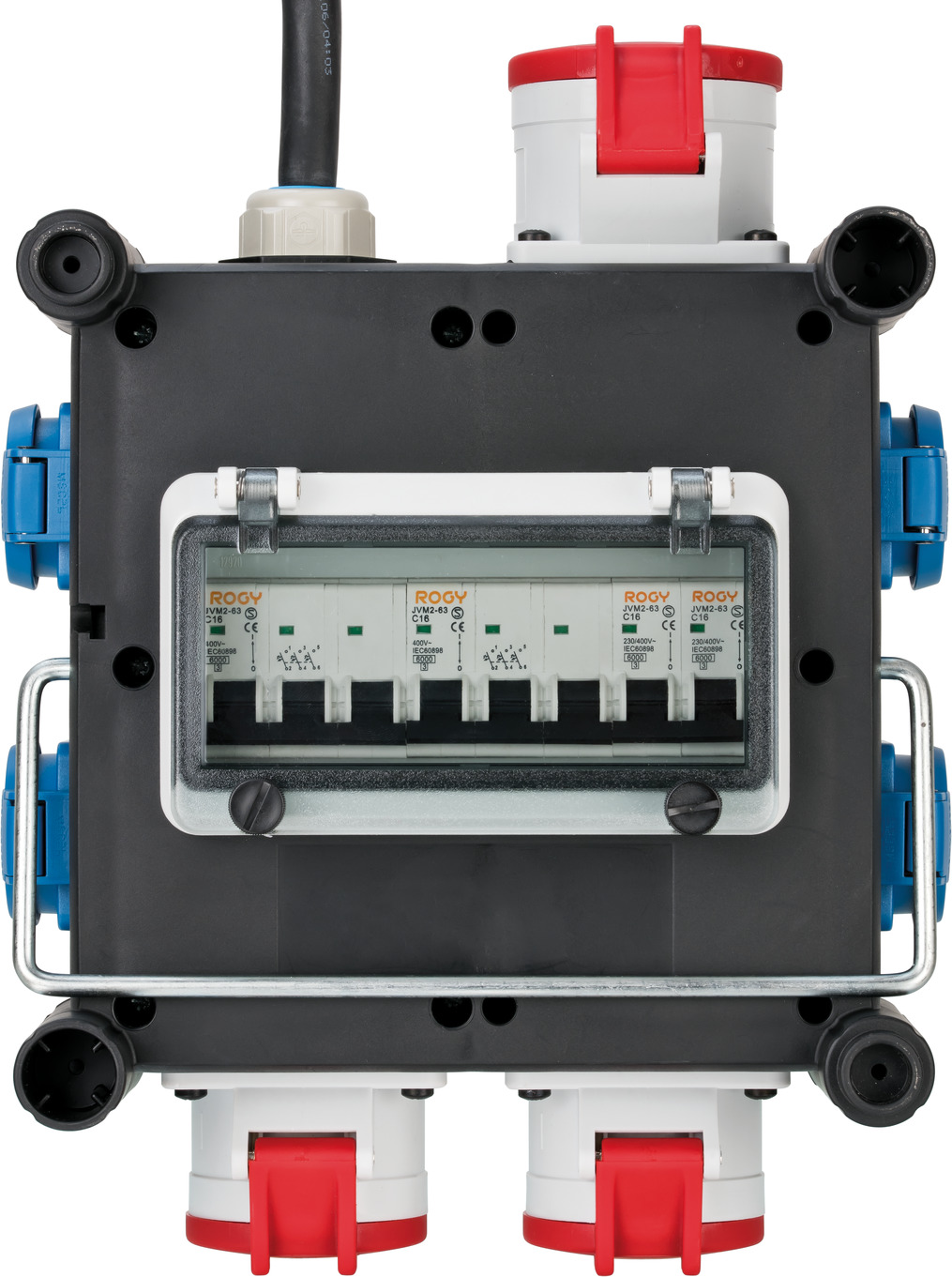 - Steckdosen: 2x CEE 400 V/16 A 5-polig/-pin, 1x CEE 400 V/32 A 5-polig/-pin, 4x 230 V/16 A