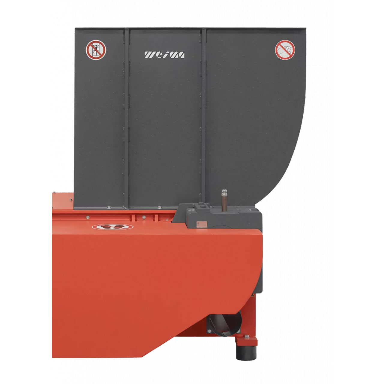 Der über eine Hydraulik horizontal vor und zurück bewegliche Schieber führt dem Rotor das Material zu. Bei WEIMA lässt er sich, ganz automatisch, lastabhängig steuern oder takten. Bei Bedarf natürlich auch manuell. Für eine noch aggressivere Zuführung empfehlen wir zusätzliche Zackenplatten und Niederhalter, die auch sperrige und lange Teile sicher an Ort und Stelle halten. Ein am Hydraulikzylinder befindliches Schockventil absorbiert auftretende Stöße der Schublade und sorgt so für eine höhere Lebensdauer.