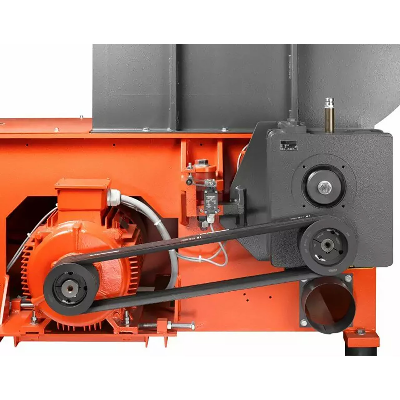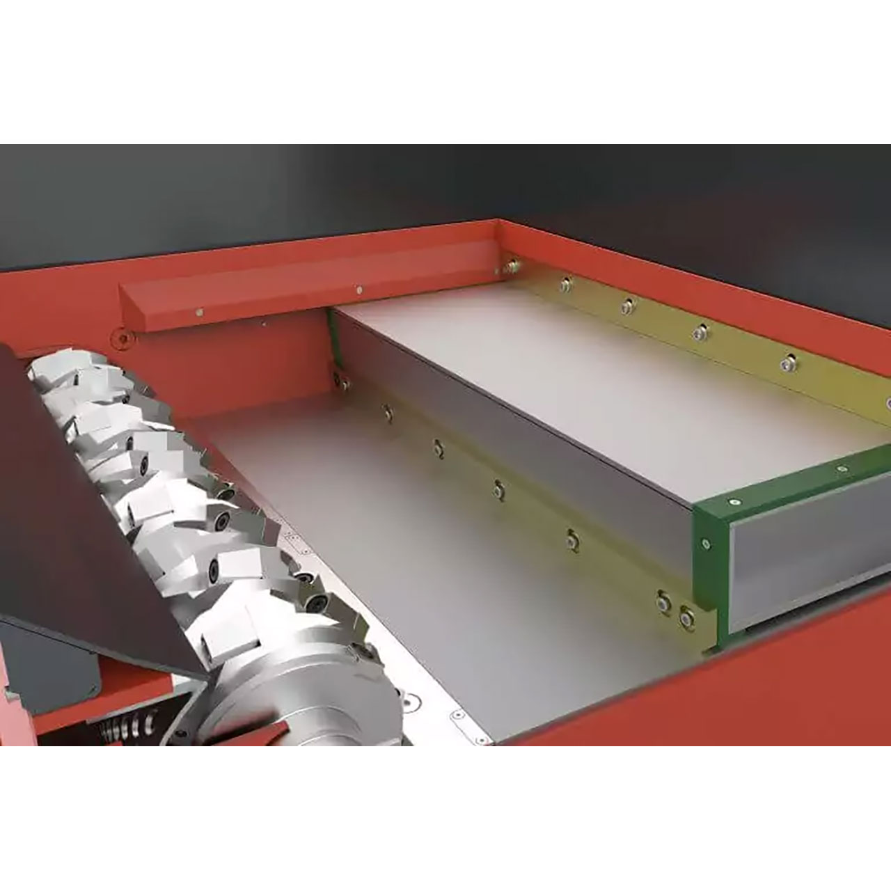 Der Trichter erfüllt gleich mehrere Aufgaben. Über ihn wird zunächst das zu zerkleinernde Material aufgegeben – händisch, maschinell oder per Förderband. Die großzügige Öffnung macht dabei auch die Befüllung sehr großer Teile bequem möglich. Für die Zerkleinerung entscheidend ist aber sein spezielles Design, das vorn abgerundet ist und somit effektiv Materialbrücken verhindert. Selbst bei sperrigen Teilen schneidet sich der Shredder so ganz von selbst frei. Bei Bedarf sind sowohl Trichtererweiterungen und Deckel mit Gasdruckfeder erhältlich.