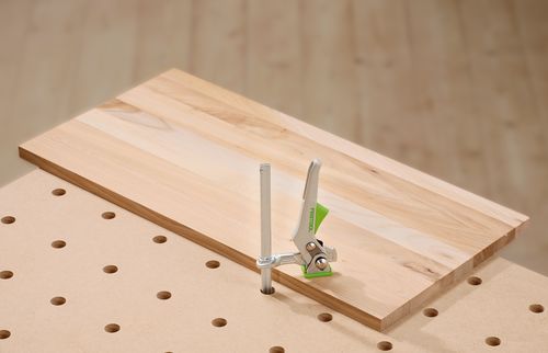 Tisch mit Lochplatte und Klappbeinen, Schwenkeinheit, Auflageeinheit, Winkelanschlag, Anschlagreiter, Führungsschiene FS 1080/2, Abweiser FS-AW, Zusatzklemmung