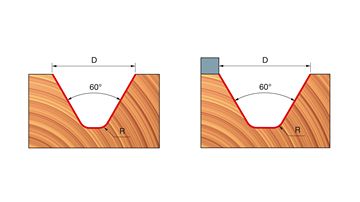 Anwendungen: Erzeugt eine V-Nut mit einem Winkel von 60° und planem Boden für Reliefbeschriftungen.