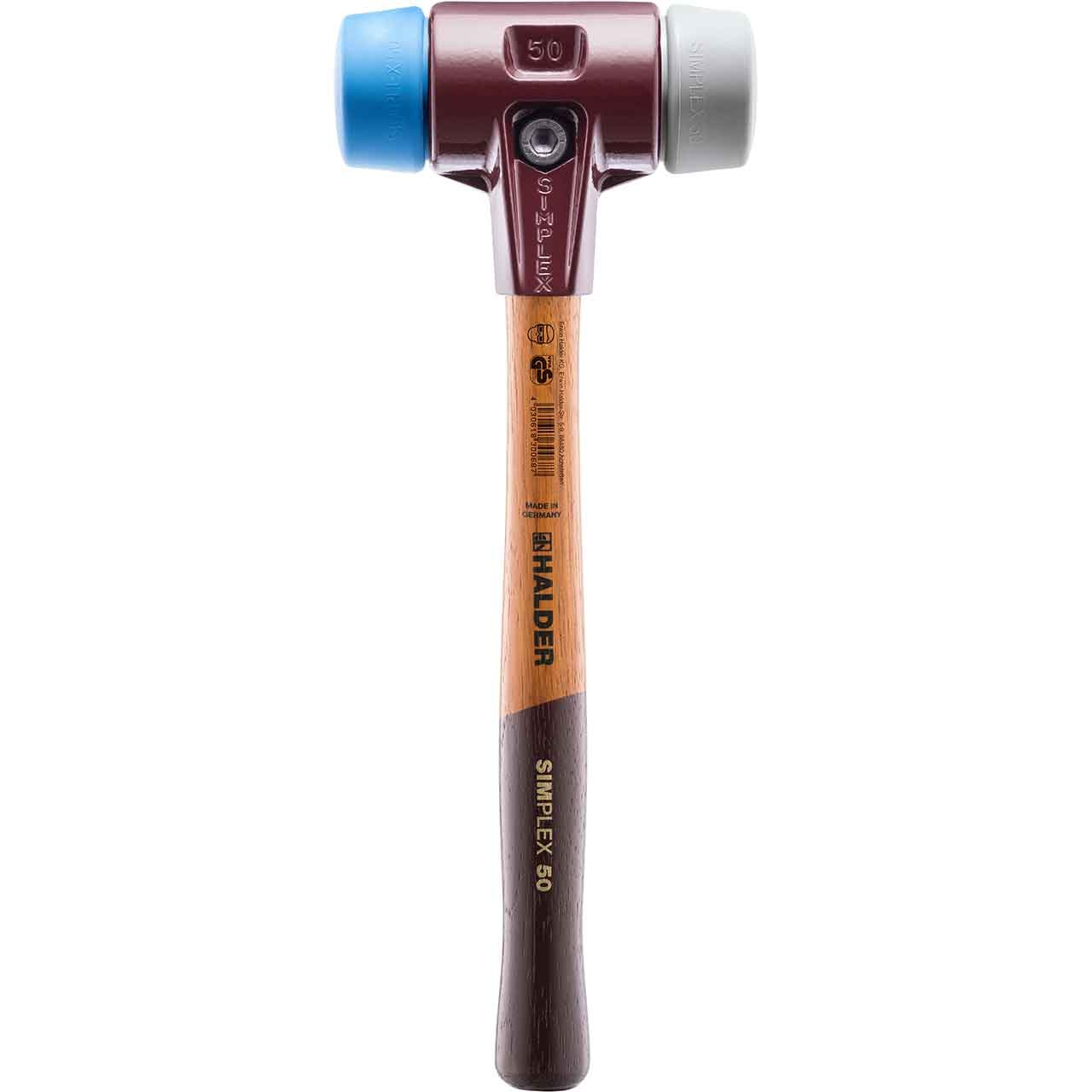 SIMPLEX – Schonhammer in der Einsatzkombination TPE-soft (blau, weich, abriebfrei) / TPE-Mid (grau, mittelhart, abriebfrei).
