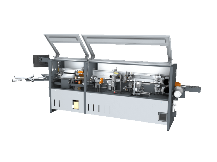 mit SPS-Steuerung (inkl. Touchscreen) und mit Schmelzkleberangabe an das Werkstück für Kantenmaterial bis 3 mm: Fügefräse (inkl. DIA-Werkzeug) bis 2 mm Frästiefe1), wartungsfreies Leimbecken mit Wechselbeckenvorrüstung inkl. Kleberauslaufvorrichtung, HFKappsägestation (ca. 12.000 U/min.), HF-Frässtation (ca. 12.000 U/min.) mit separater pneumatischer Fräsverstellung und Wechselplattenfräser (Kombiausführung), Eckenabrundfräse, Radiusziehklinge, Flächenziehklinge (inkl. pneumatischem Aushub), Putzstation, robuster Kettenantrieb, kugelgelagerter Doppelrollenoberdruck, Sichtfenster von Maschinenrückseite, ausziehbare Werkstückauflage, Vorschub ca. 10 m/min.