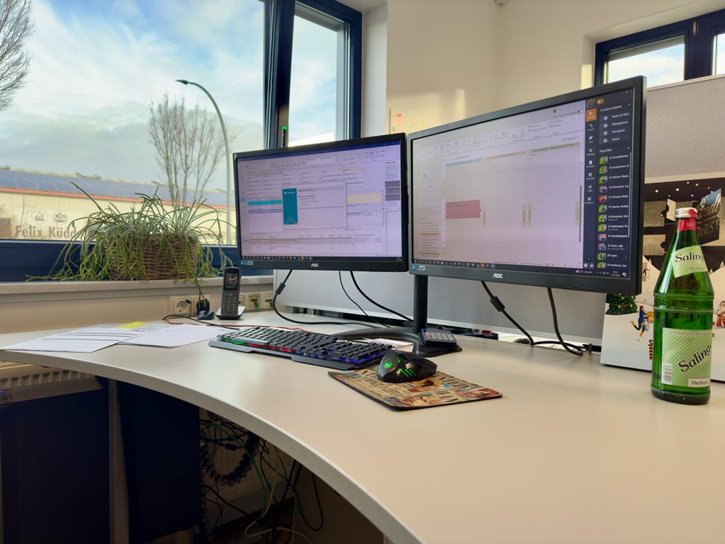 Du arbeitest mit fortschrittlichen IT-Lösungen, Geräten und Workflows an einem höhenverstellbaren Schreibtisch.