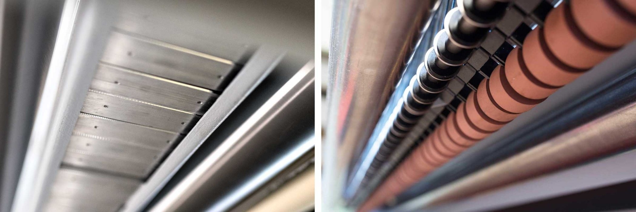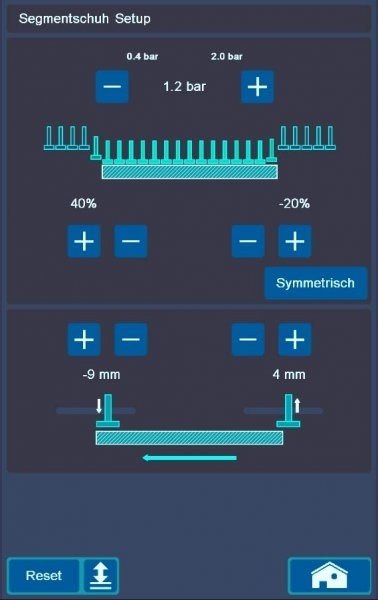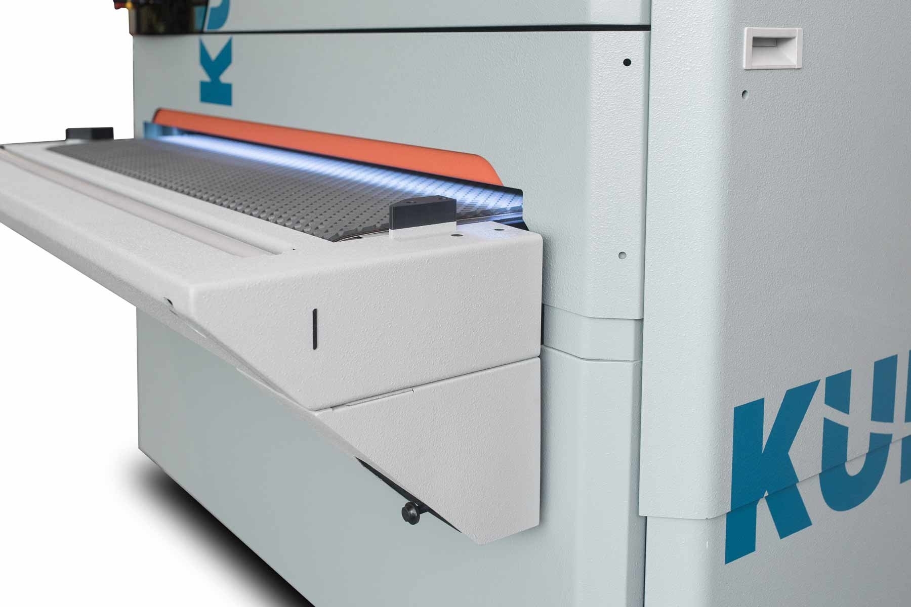 Ein segmentierter Schleifschuh ist integraler Bestandteil jeder Lackschleifmaschine. Bei KÜNDIG sind nicht nur die Elemente zur Abtastung am Maschineneingang 22mm schmal. Auch die Schleifsegmente verfügen über die selbe, präzise 22mm Teilung. Dieses komplexe Präzisionsinstrument will einfach und übersichtlich bedient werden. Im Segmentsteuerungs-Bildschirm wird auf der obersten Stufe der Gesamt-Schleifdruck angepasst. Auf der mittleren Stufe kann der Druck an den Werkstückrändern präzise reguliert und wahlweise sogar ganze Segmente hinzugefügt oder abgezogen werden. Auch asymmetrische Einstellungen, das bedeutet unterschiedliche Werte am linken und rechten Werkstückrand sind möglich. Weiter unten kann das Ein- und Aussetzen des Schleifschuhs vor- oder zurückverlegt werden. Damit wird der Schliff an den vorderen und hinteren Werkstückrändern perfektioniert. Im Hintergrund regelt eine eigens entwickelte Steuerungseinheit, welche die Benutzereingaben in Millisekunden umsetzt und wenn nötig auch bei extrem schnellen Vorschubgeschwindigkeiten (z.B. in industriellen Fertigungslinien) mit höchster Präzision arbeitet. Diese Technologie findet sich sowohl in den segmentierten Längs- (bzw. Diagonal-) Aggregaten, als auch in den Querband-Schleifaggregaten.