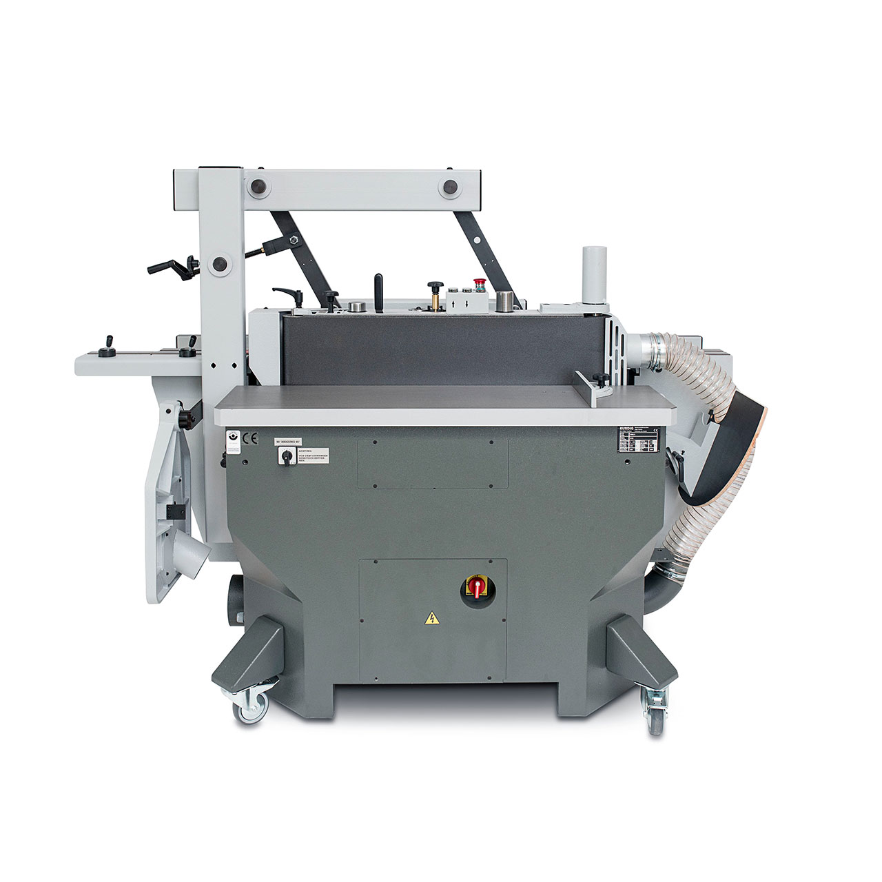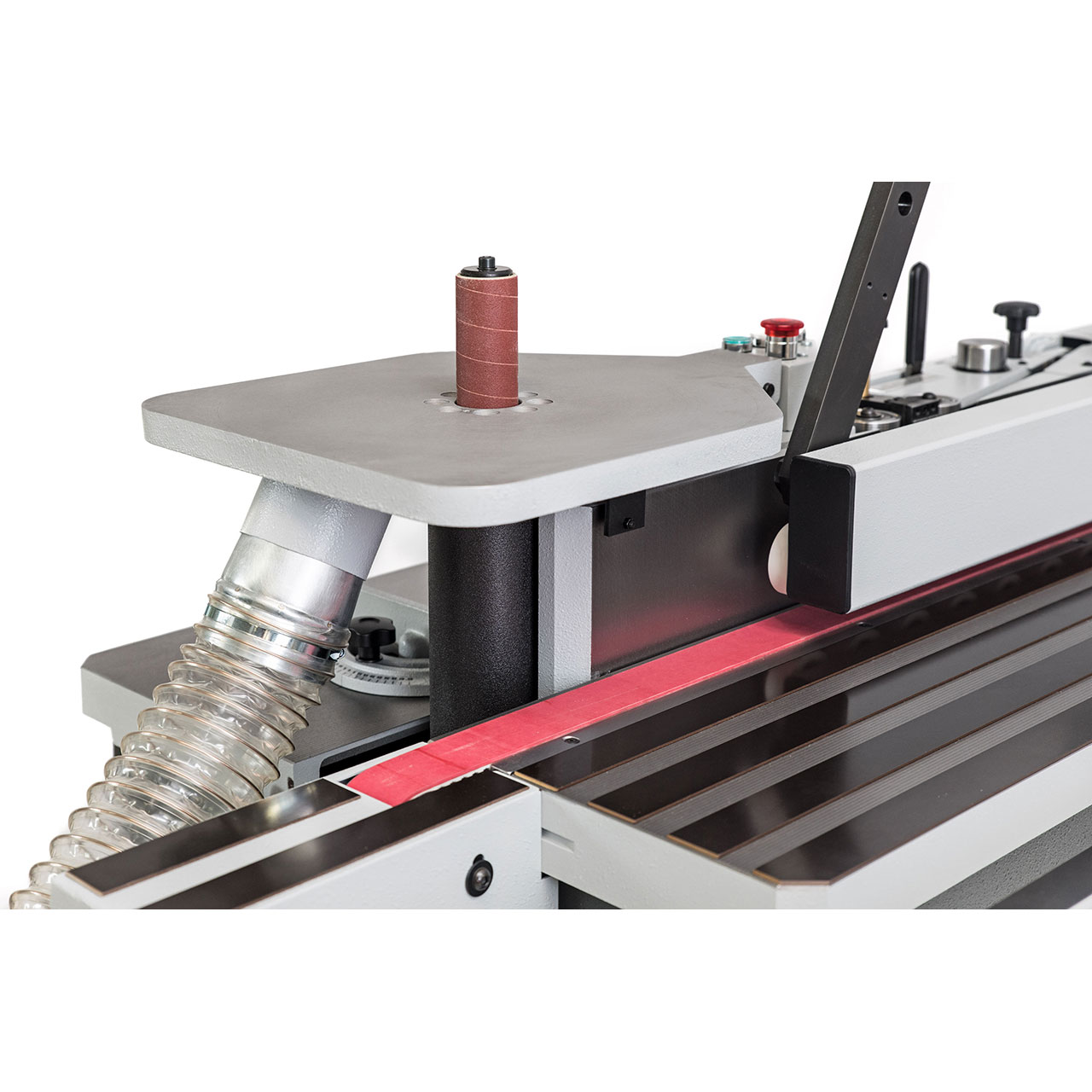 - auf der Antriebswalze mit einem wahlweise schnell aufbaubaren Hilfstisch aus Guss (mit Bohrungen für die Staubabsaugung) 400 x 500 mm auf oszillierendem Dorn für Verwendung von Schleifwalzen Ø 25, 30, 40 und 45 x 100 mm für Aussen- und Innenrundungen, mit Schutzabdeckung für Dorn Ø 25, 30, 40 und 45 x 100 mm für Aussen- und Innenrundungen, mit Schutzabdeckung für Dorn