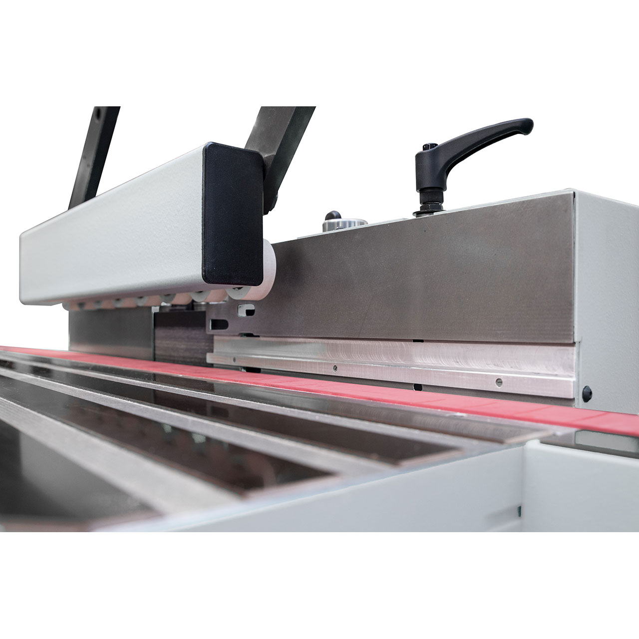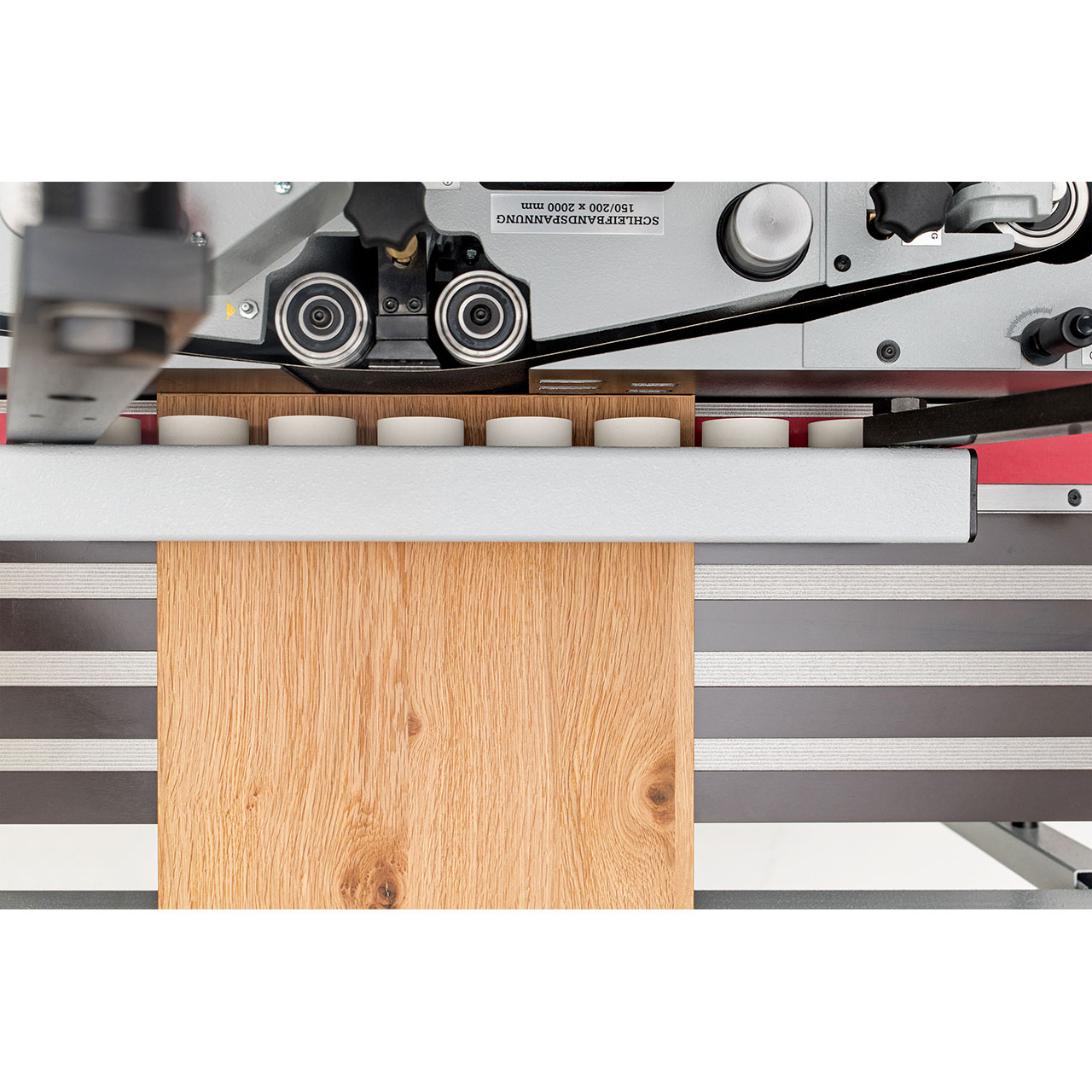 - auf der Furnierschleifseite den 2 Anschlagplatten entlang (der Einlaufanschlag mit integrierten Absaugschlitzen und gemäss Spanabnahme nach Skala feinregulierbar) auf das elastische Schleifkissen (mitoszillierend für gleichmässige Nutzung des Graphitbelages, inkl. Kornausgleichsverstellung und Bandzugsentlastung über 2 Umlenkrollen), mit Einlaufanschlagverlängerung, Tisch 1180 x 325 mm