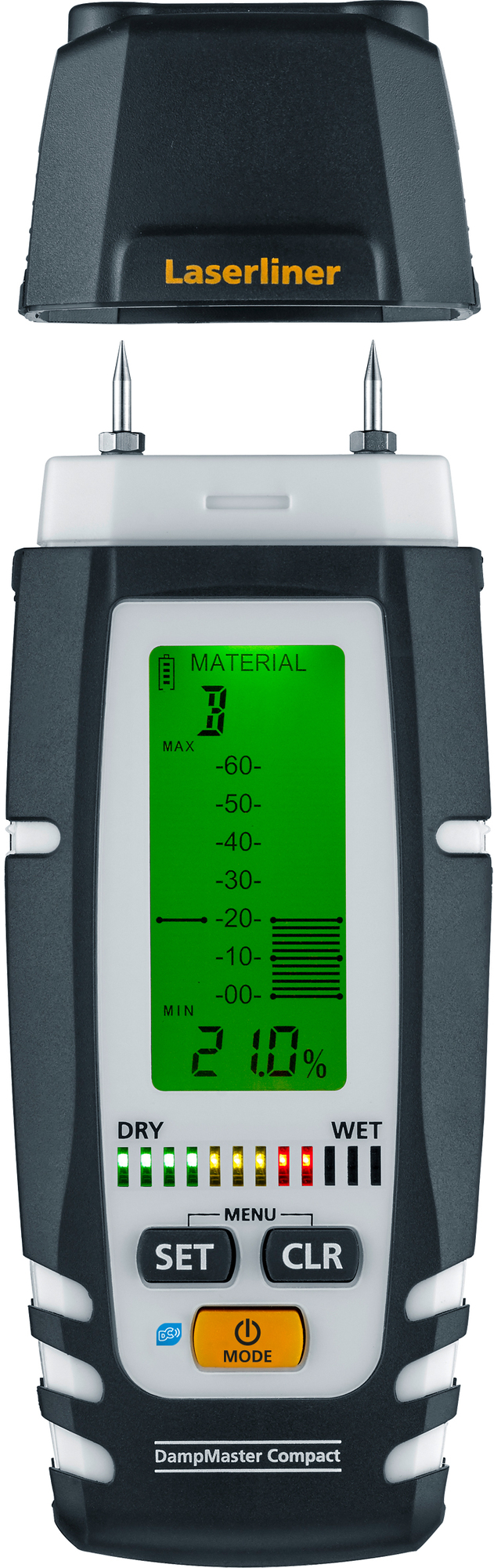 Das professionelle Materialfeuchtemessgerät mit Tiefenelektroden dient der Erfassung von Holz- und Baufeuchte. Mit den auswählbaren Holz- und Baumaterialien können exakte, spezifische Messungen durchgeführt werden. Der Nass-Trocken-Indikator mit zwölf farbigen LEDs gibt direkt Auskunft über den Feuchte- beziehungsweise Trocknungsgrad des Prüflings. Der Index-Modus ermöglicht das schnelle Orten von Feuchtigkeit durch Vergleichsmessungen. Per Digital Connection-Schnittstelle können die ermittelten Daten einfach auf ein Smartphone übertragen werden.