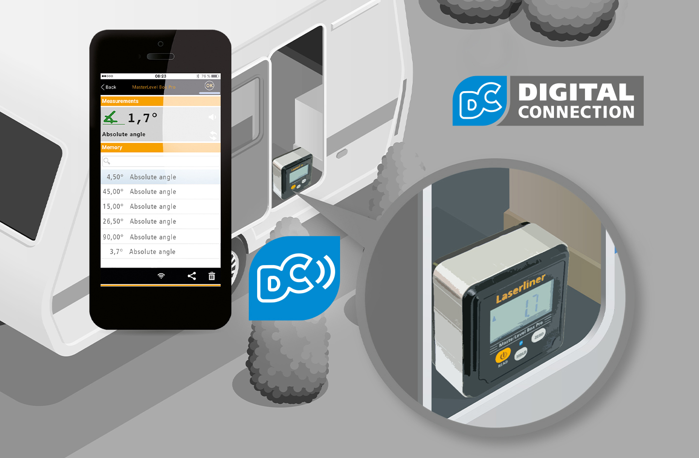 Diese digitale Elektronik-Wasserwaage ermöglicht das Übertragen von Winkeln und das genaue Ausrichten von Neigungen. Die ermittelten Messwerte können über die Digital Connection-Schnittstelle auf ein Smartphone übertragen werden. Das Display dreht sich bei Über-Kopf-Messungen mit und ist daher in jeder Lage gut ablesbar. Das Gerät kann leicht an metallischen Oberflächen angebracht werden und findet durch die kompakte Bauform in jeder Hemdtasche und Werkzeugkiste Platz.