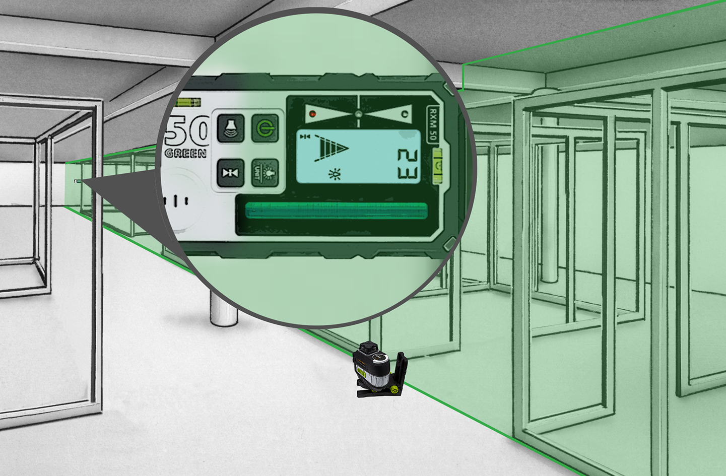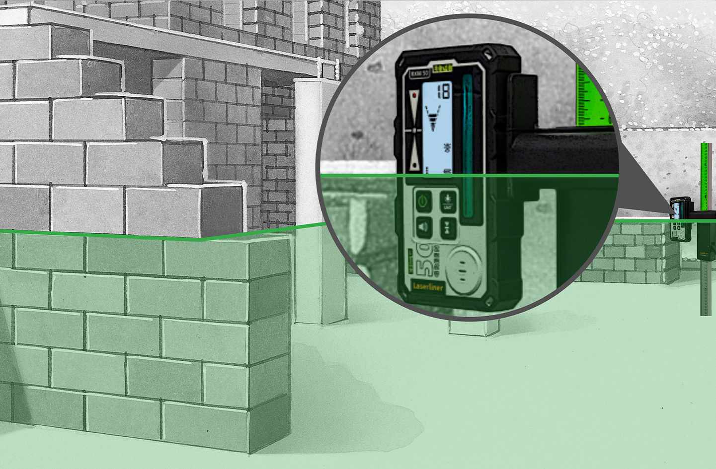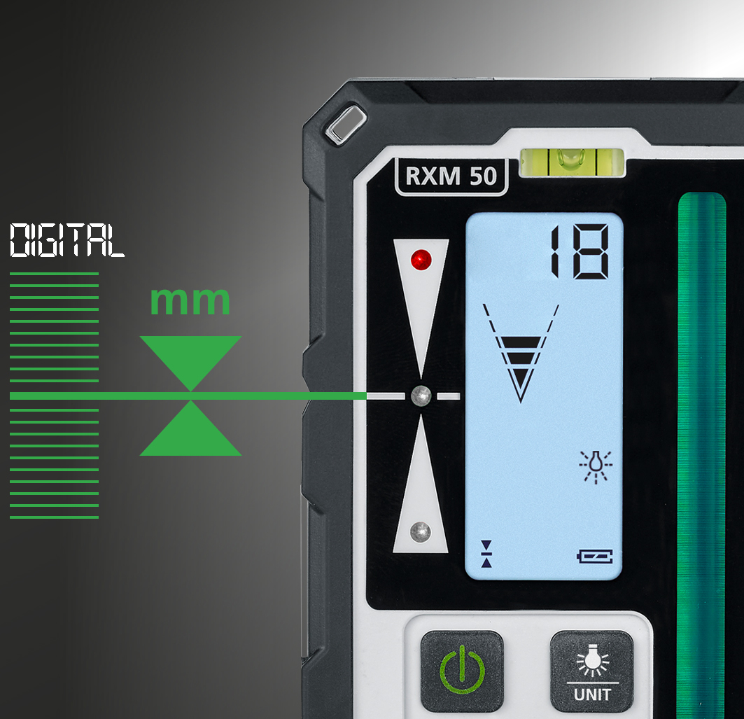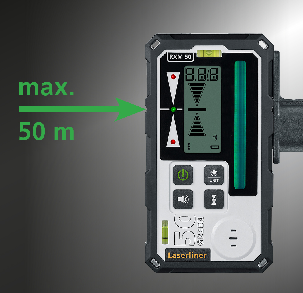Dieser Laserempfänger ermöglicht schnelle Ausrichtarbeiten im Nah- und Fernbereich und eignet sich für alle grünen Linienlaser mit GRX-READY Technologie. Er detektiert zeitsparend die mit hoher Frequenz pulsierenden Laserlinien bis zu einer maximalen Entfernung von 50 Metern. Per Pfeilsymbol und Millimeter-Anzeige wird der Anwender über den exakten Höhenunterschied des Laserstrahls zur Markierebene informiert. Das Ablesen der Messwerte ist dank großer LC-Displays auf beiden Seiten des Empfängers einfach und in kurzer Zeit möglich. Durch das Display auf der Rückseite besteht die Möglichkeit, auch entgegen der Austrittsrichtung des Laserstrahls zu arbeiten und die Messwerte abzulesen.