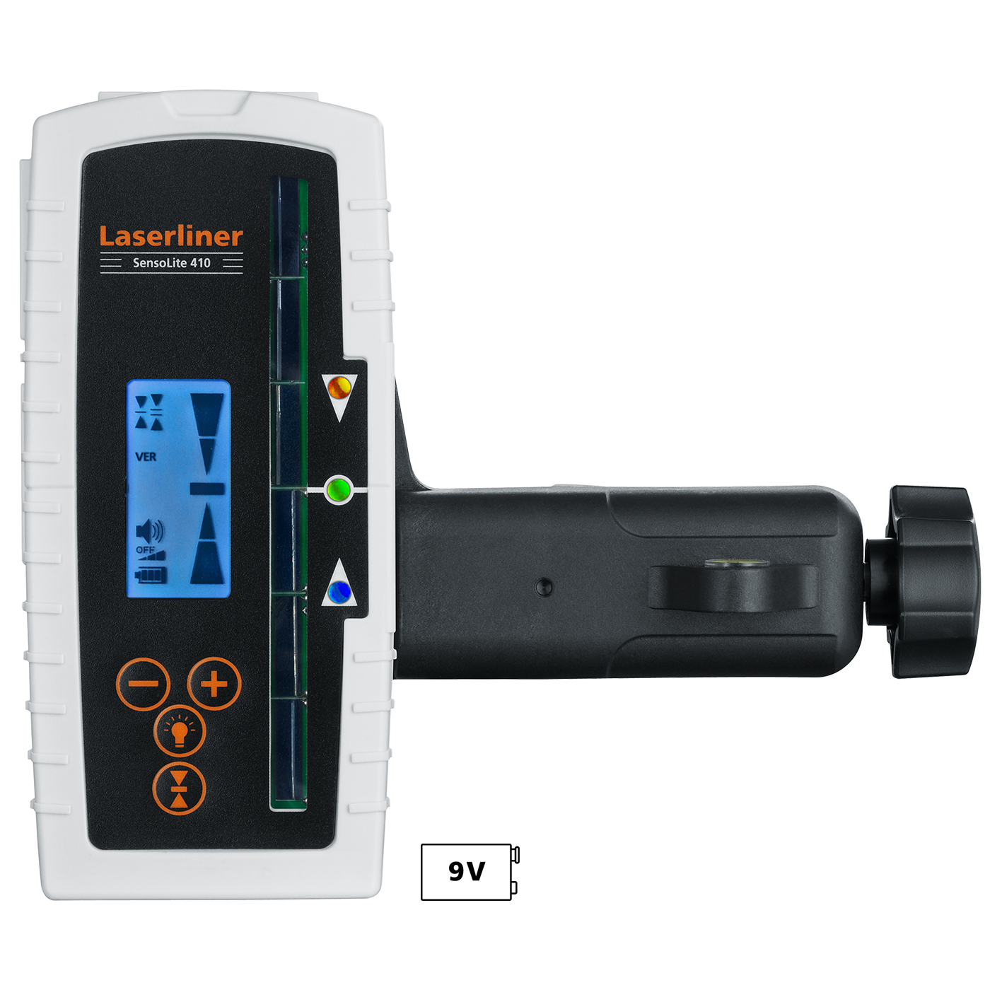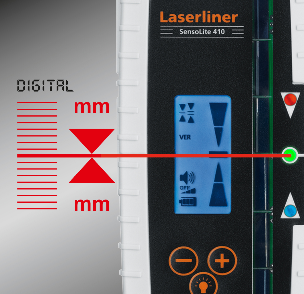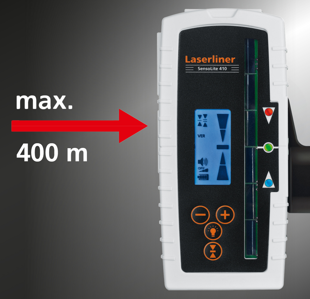 Dieser Hochleistungs-Laserempfänger für rote und grüne Rotationslaser verfügt über einen extra großen Empfangsbereich von 400 Metern, ideal zum schnellen Erfassen des Lasers auf großer Distanz. Das wasserdichte Gehäuse ist mit Kopf- und Seitenmagneten für eine einfache Anbringung an metallischen Oberflächen ausgestattet. LC-Displays auf Vorder- und Rückseite sowie akustische Melodien zeigen die Höhe des Laserstrahls an. Die Fernerkennung erfolgt über drei farbige LEDs, welche vorne, hinten und seitlich angeordnet sind. Per Versus-Funktion überwacht der Empfänger die Referenzhöhe des Lasers und warnt mit optischen und akustischen Signalen vor Fehlmessungen.