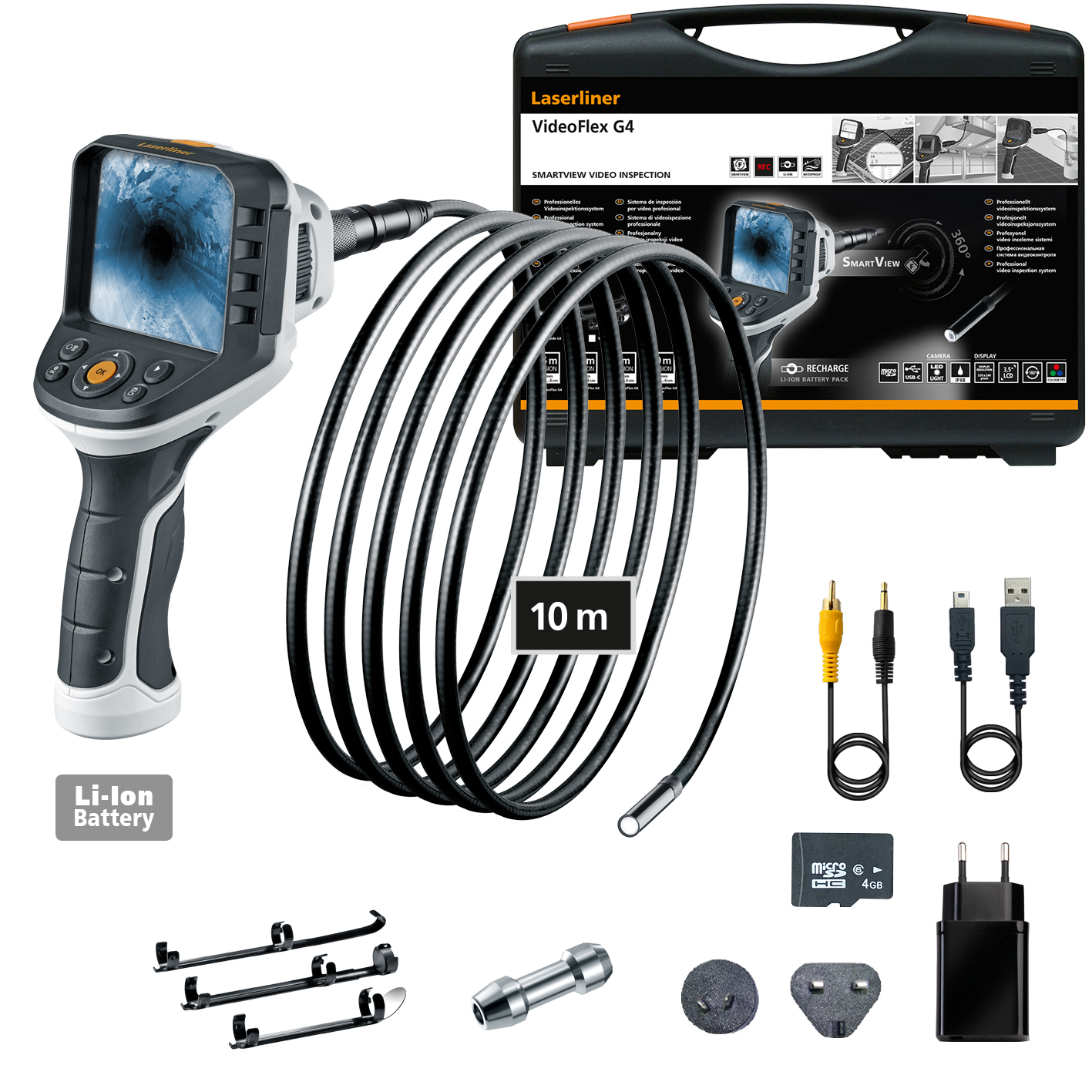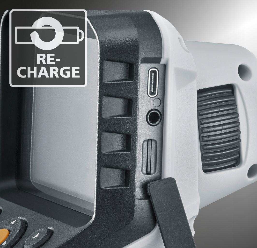 Das professionelle Videoinspektionssystem ermöglicht visuelle Kontrollen an schwer zugänglichen Stellen, beispielsweise in Rohrleitungen, Wandhohlräumen und Kraftfahrzeugen. Der Anwender hat eine einfache räumliche Orientierung durch intuitives Drehen der Basiseinheit. Für den Einsatz auf großer Distanz ist der extrem lange Flexschlauch ideal. Mit effektiver LED-Objektbeleuchtung gelingen selbst unter schlechten Bedingungen aussagekräftige Aufnahmen. Aufgrund einer naturtreuen Wiedergabe von Farben wird eine realitätsnahe Darstellung geboten. Details lassen sich über die Zoom-Funktion klar erfassen. Das ergonomisch designte Gerät liegt gut in der Hand und ist auch bei längeren Arbeiten angenehm zu nutzen. Acht verfügbare Sprachen und die wechselbare Kameraeinheit sorgen für vielfältige Einsatzmöglichkeiten. Eine SD-Speicherkarte dient zur Dokumentation und die USB-C-Schnittstelle zum Auswerten der Bilder und Videos.