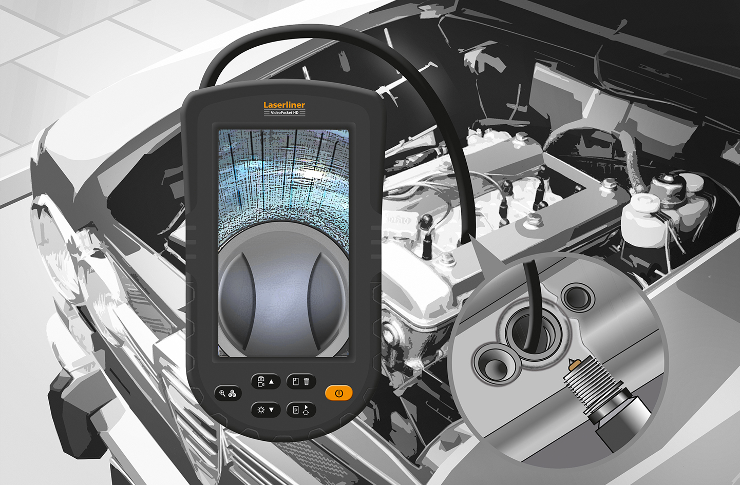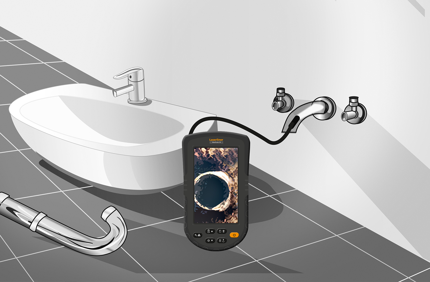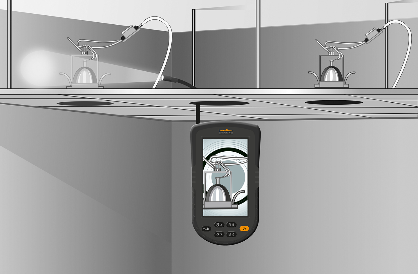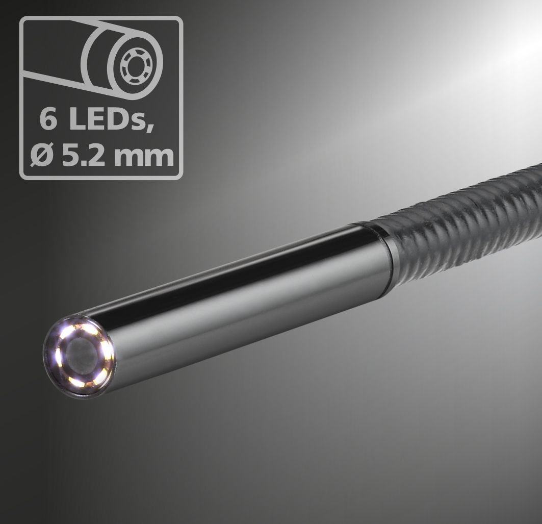 Dieses hochauflösende und kompakte Videoinspektionssystem ermöglicht detailreiche visuelle Untersuchungen von schwer erreichbaren Stellen, unter anderem in Rohrleitungen, abgehängten Decken und Kraftfahrzeugen. Während des Einsatzes sorgen sechs Hochleistungs-LEDs an der wasserdichten Kameraeinheit für eine effektive, in zehn Stufen einstellbare Objektbeleuchtung. Einzelheiten lassen sich über die Zoom-Funktion klar erfassen. Dank des großen Farbdisplays und der Bildausrichtung sind die Inspektionsergebnisse optimal erkennbar. Per Bildvergleichsfunktion können Anwender die Unterschiede zwischen dem Live-Bild und einem gespeicherten Referenzbild direkt feststellen. Die Dokumentation der Bild- und Videoaufnahmen kann mit dem internen Fotospeicher und einer Micro-SD-Karte erfolgen. Aufgrund der geringen Größe überzeugt das Gerät durch ausgezeichnete Handlichkeit und Transportfähigkeit. Mit den Magnet- und Hakenaufsätzen können schwer erreichbare Gegenstände angezogen und angehoben werden. Der Spiegelaufsatz erlaubt es, Objekte im 90° Winkel zu betrachten.