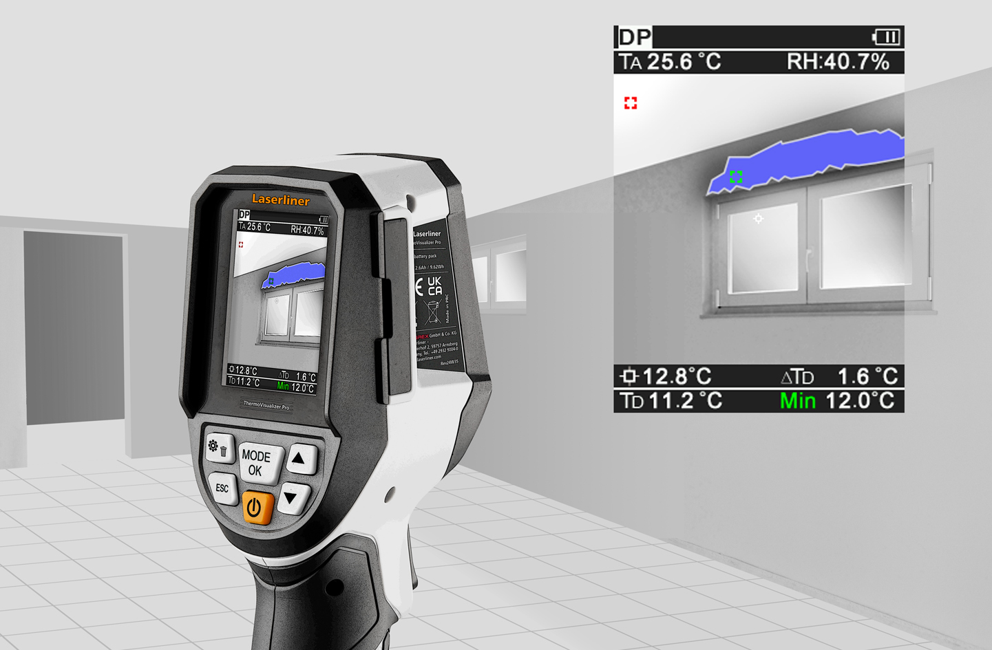 Diese innovative Thermokamera ermittelt Oberflächentemperaturen, die relative Luftfeuchte, Umgebungstemperatur und Taupunkttemperatur. Sie visualisiert aussagekräftig Temperaturverläufe, Wärmebrücken und Kondensationsfeuchte. Dabei bildet die visuelle Taupunktfunktion eine Fusion aus Thermokamera, Digitalkamera und Hygrometer. Das erzeugt aussagekräftige Wärmebilder mit konkreter Markierung von Oberflächen, welche die Taupunkttemperatur erreicht haben oder unterschreiten, ideal für kritische Innenraum-Inspektionen. Zu den vielfältigen Einsatzmöglichkeiten zählen neben der Gebäudeinspektion Arbeiten an elektrische Anlagen, Maschinen, Heizungs- und Lüftungsanlagen sowie Ortung von Wärmequellen oder Kältebereichen.