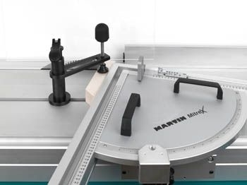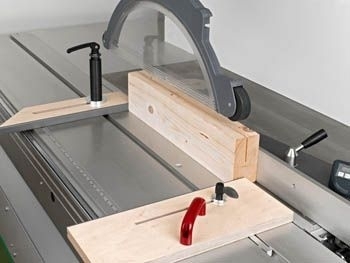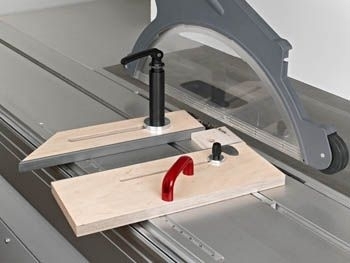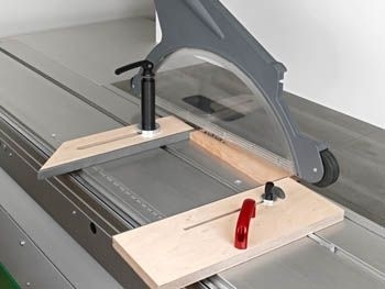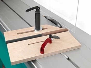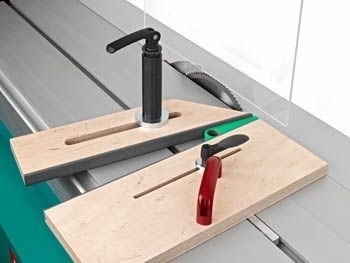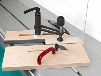 Die Spannarmlänge und der Nutenstein am Schwenkspanner sind ausgelegt für Altendorf Maschinen. Diverse Hilfsanschläge lassen sich passend zu den Werkstücken, schnell, sicher und einfach platzieren bzw. fixieren.