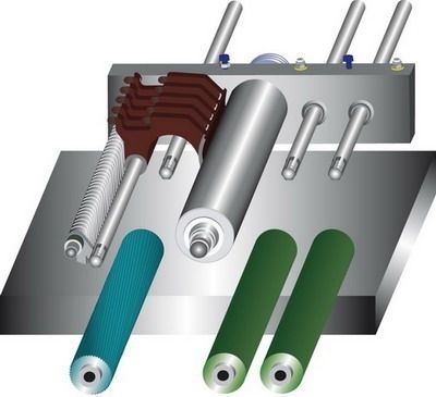 - Zwei obere gummibeschichtete Vorschubwalzen im Auslauf