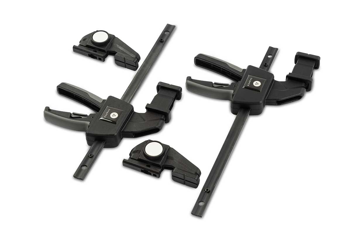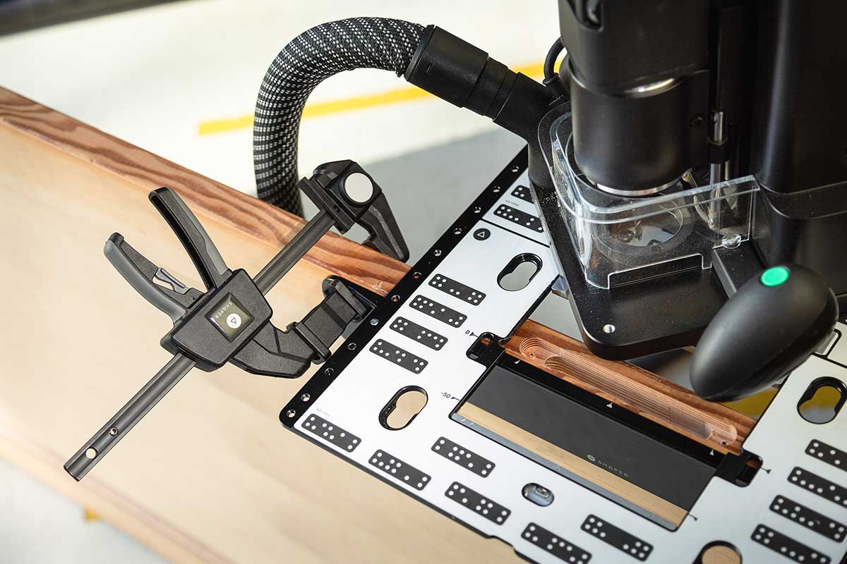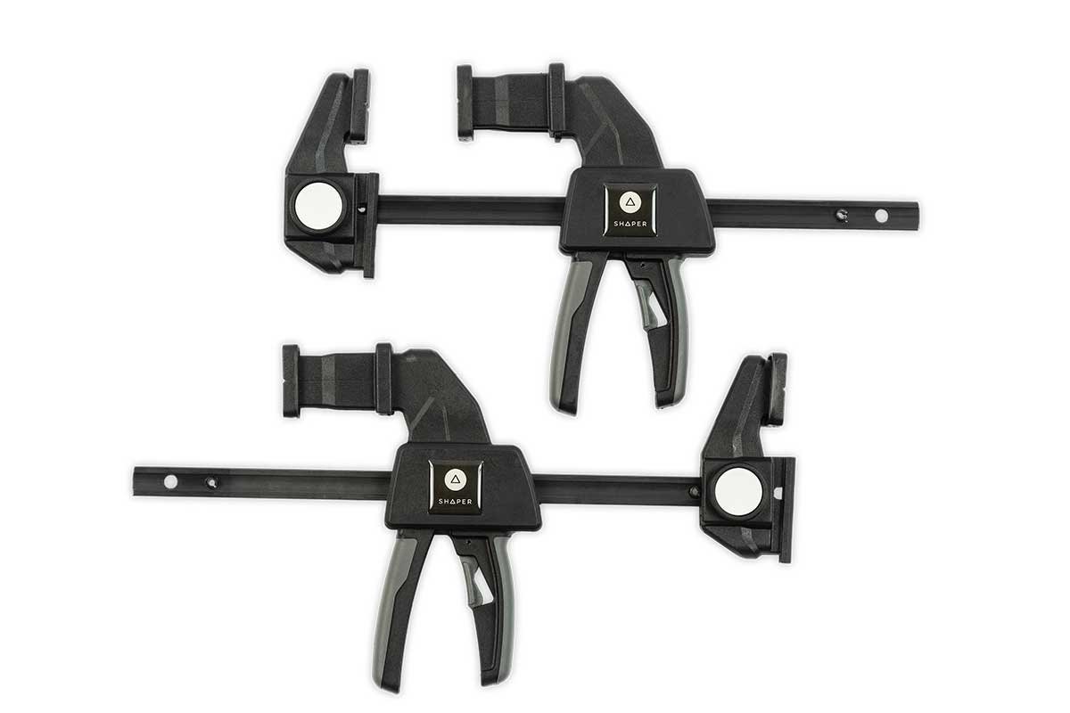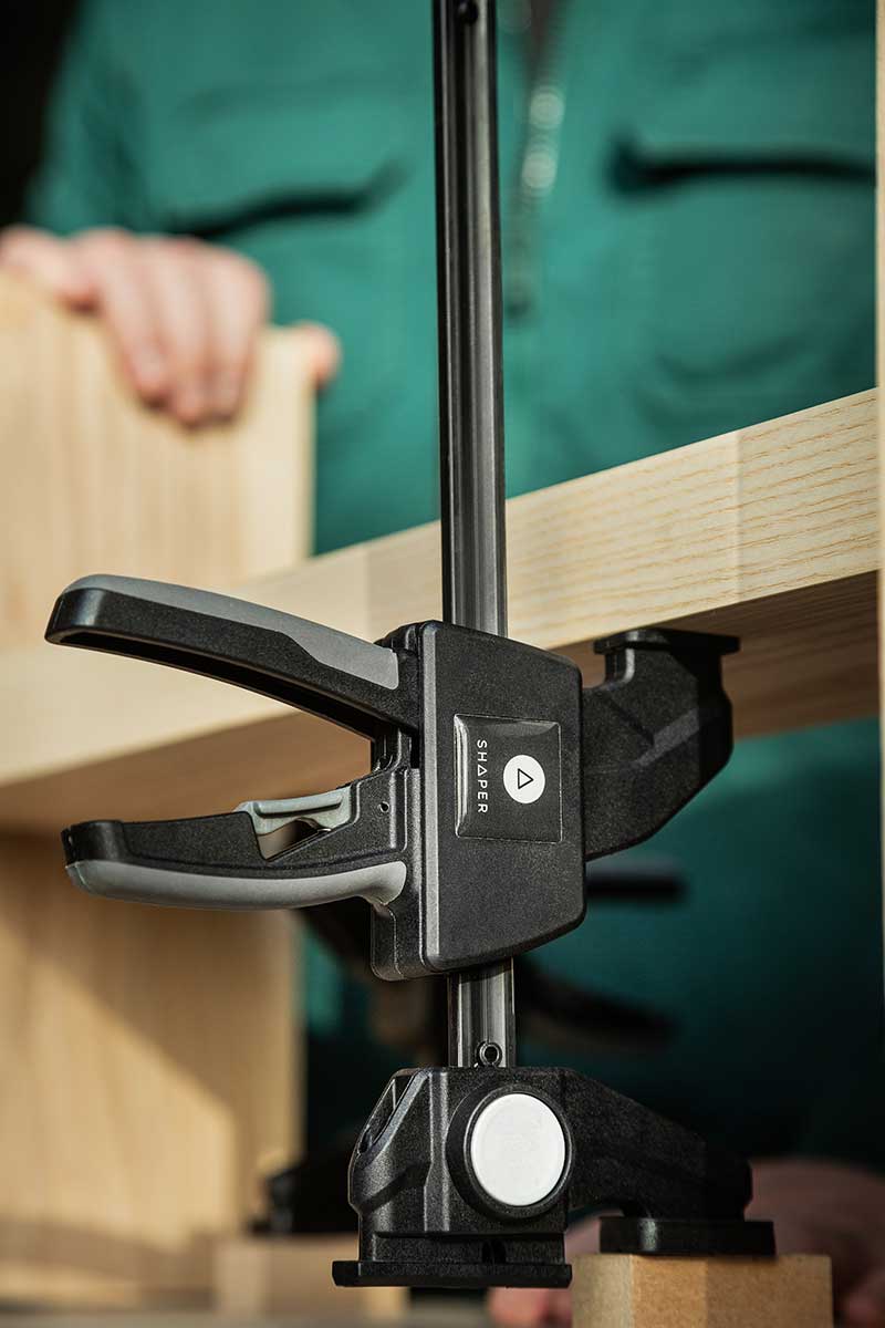 Mit den umkehrbaren Zwingen von Shaper bist du völlig flexibel. Du möchtest von Klemmen auf Spreizen wechseln? Drücke einfach den Knopf am Zwingenkopf und ändere die Spannrichtung.