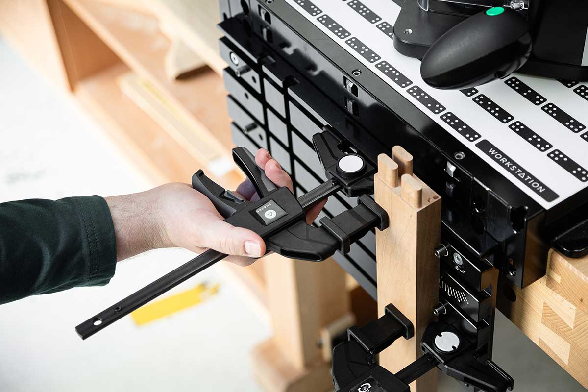 Schiebe die Zwingen in die T-Nuten von Workstation oder anderen passendem Zubehör für zuverlässiges Fixieren.