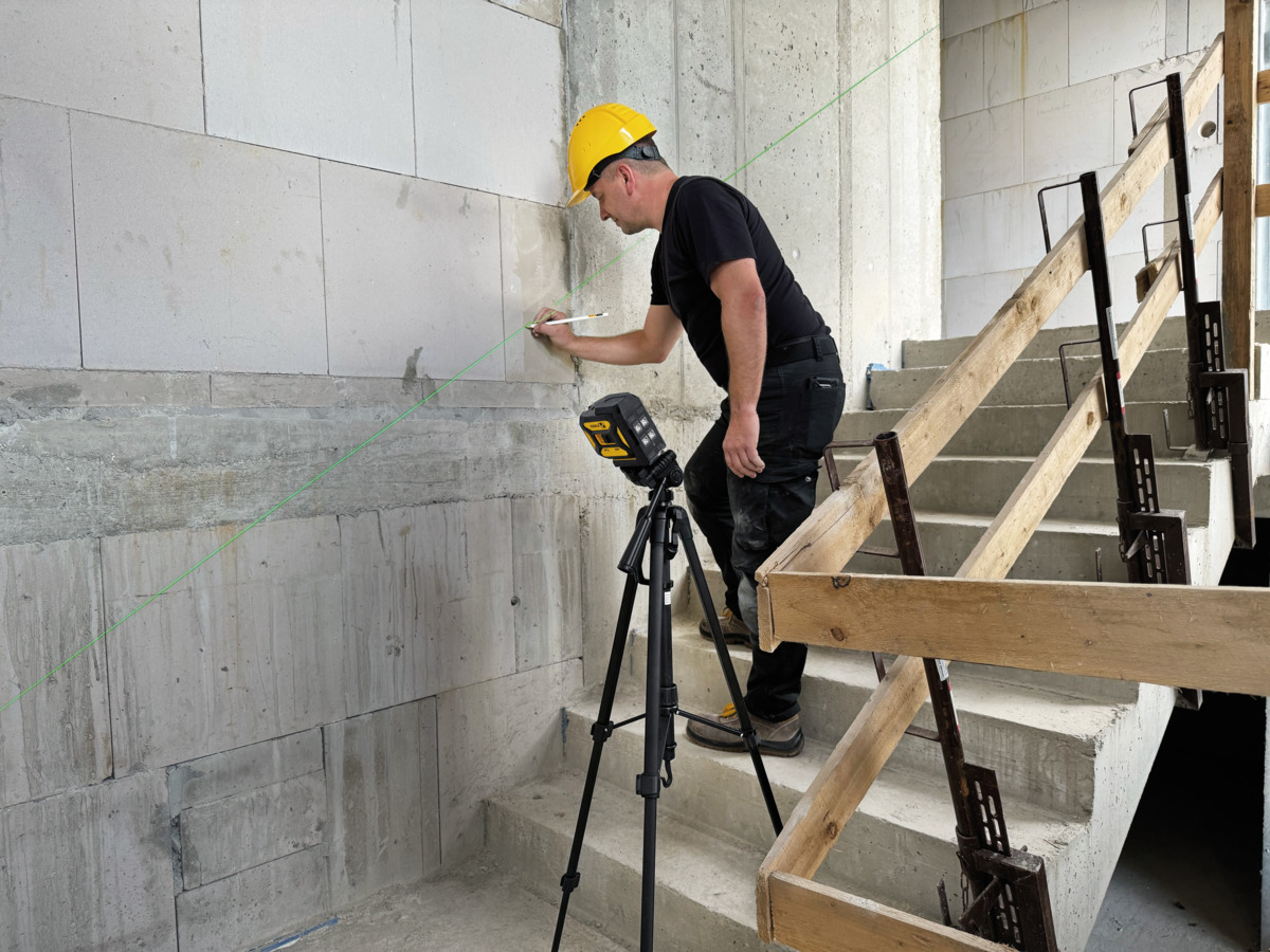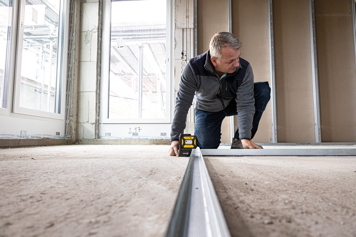 Bei Elektroinstallationsarbeiten: Schalter und Steckdosen anzeichnen, Kabelkanäle horizontal und vertikal zueinander ausrichten, Beleuchtungen ausrichten und montieren.