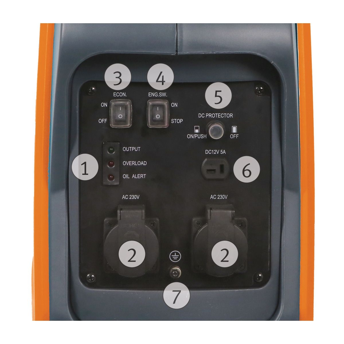 - Kontrollleuchten für Ausgangsspannung, Überlastung und Ölmangel